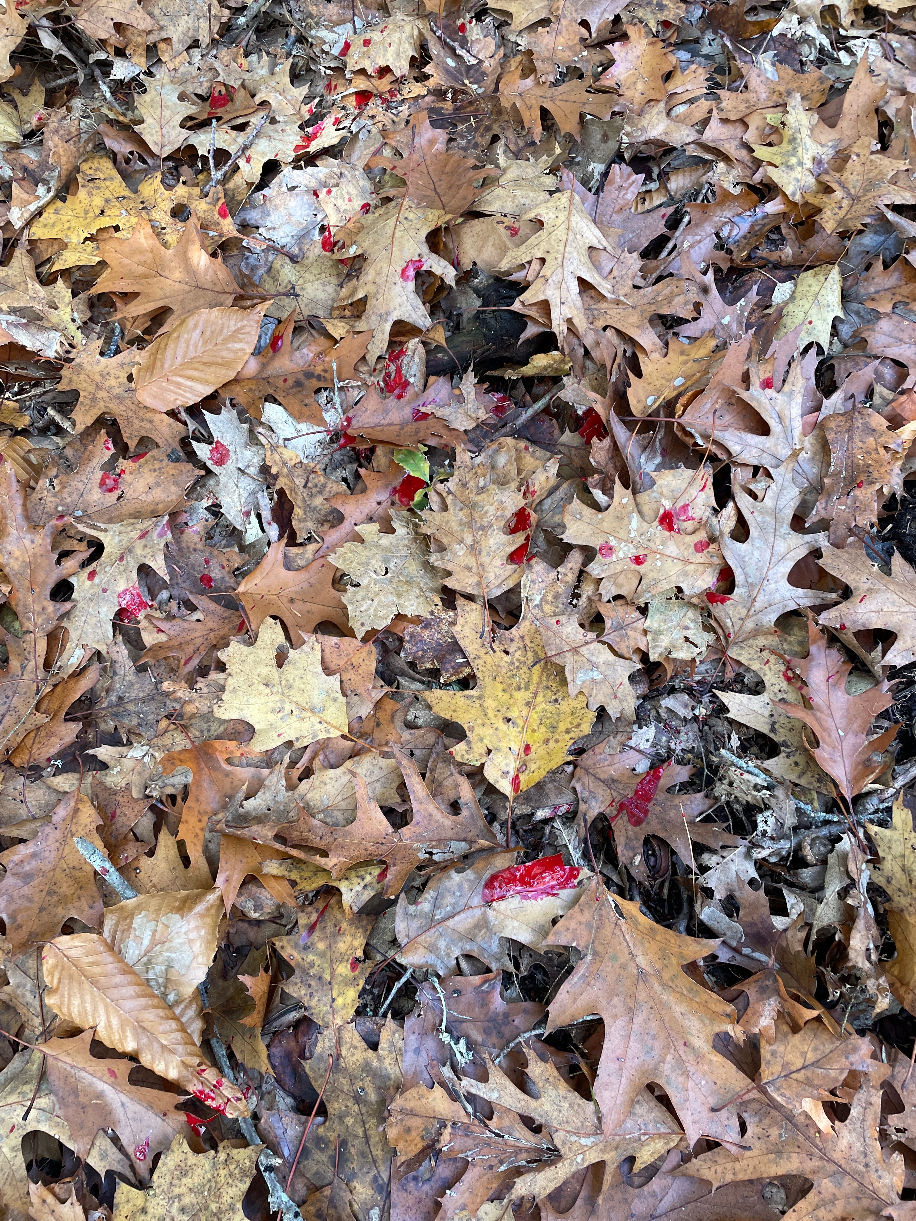 We followed the trail of blood through the woods. It was an interesting thing. Leaves turn red in the fall for a couple of reasons. They turn red when they’re changing colors. But they also turn red from blood.