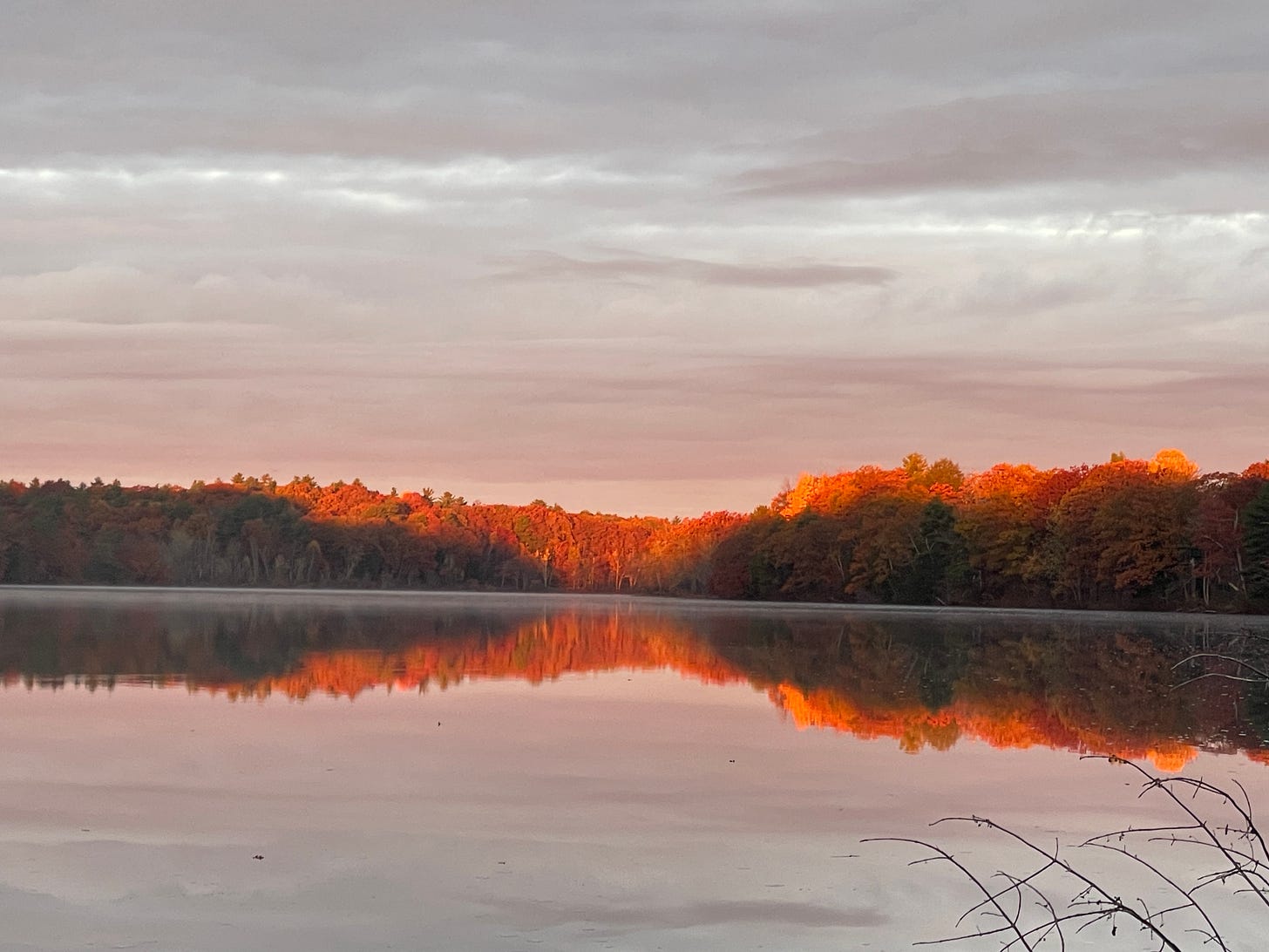 Light can sit under a gray sky. That is what I saw on the water. The treeline was lit up like a quiet fire while the clouds held their place. The river carried both without argument. Shore and reflection. Warmth and cool. It felt like Friday and Saturday in the same frame.
