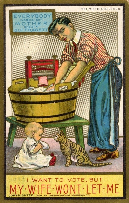I was recently listening to an older episode of the Man Enough podcast. The guest was Alok, a gender non-conforming internationally acclaimed poet, comedian, public speaker, and actor. Something they said struck me. They were talking about anti-suffrage postcards from the early 1900s. Postcards made by people who were afraid of what would happen if women got the right to vote.