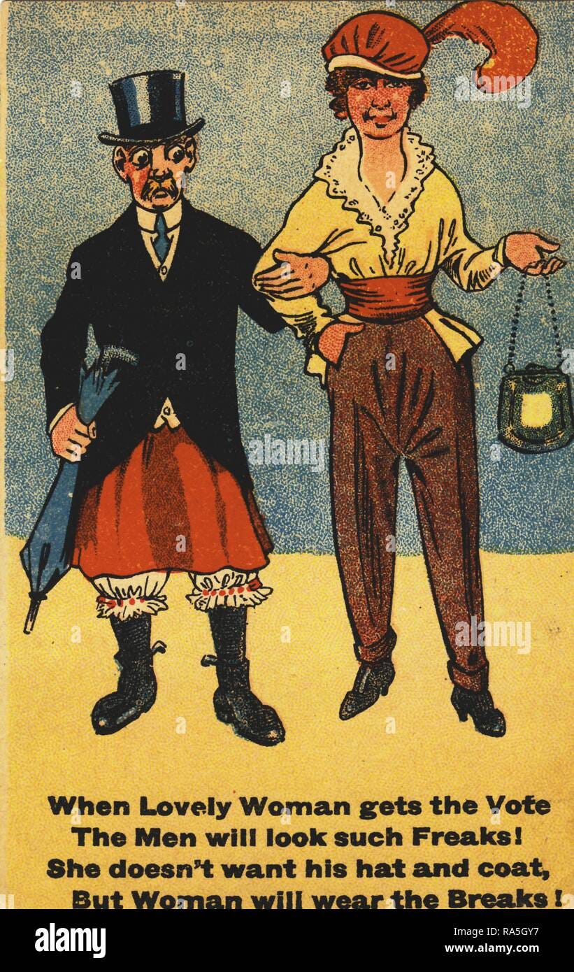 Another had a woman dressed as a man. And a man dressed as a woman with the caption, “When lovely woman gets the right to vote, the men will look like such freaks! She doesn’t want his hat and coat, but will wear the breaks!” Breaks is likely referring to breeches or pants, but they were playing with rhymes.