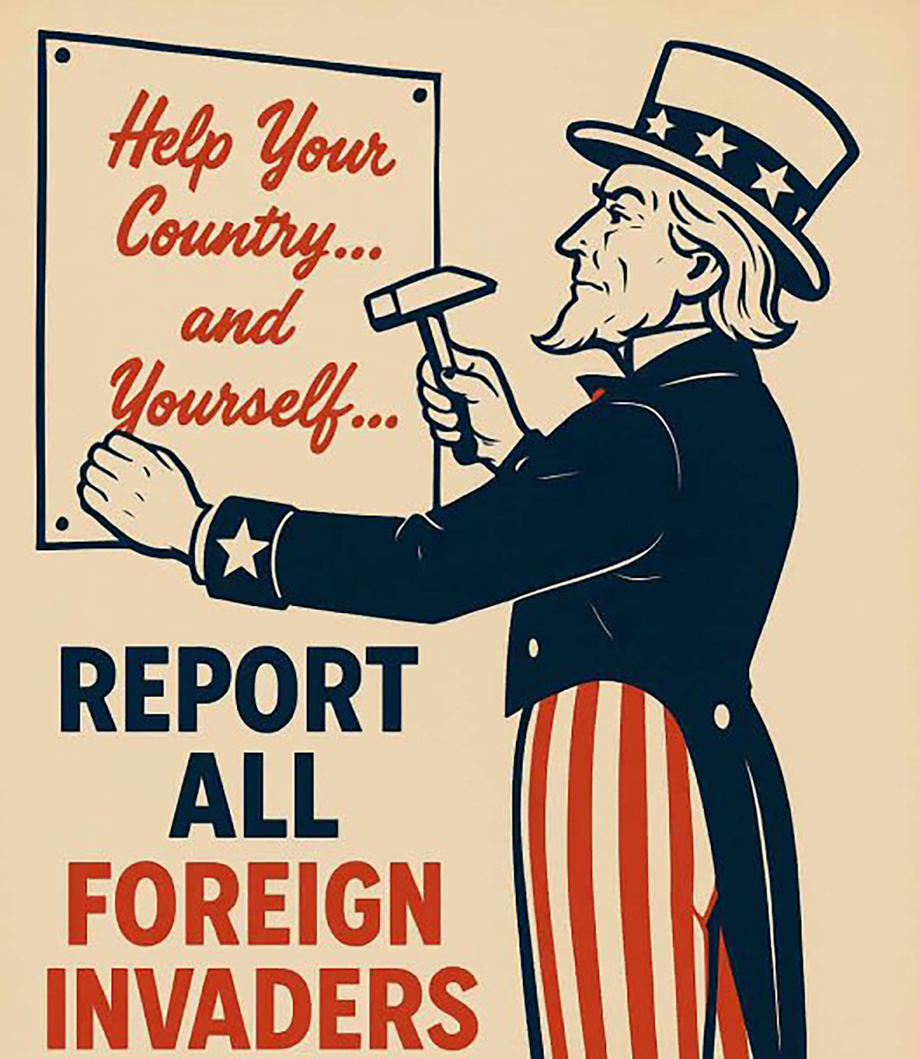 Another borrowed a vintage Uncle Sam to warn Americans to “report all foreign invaders.”