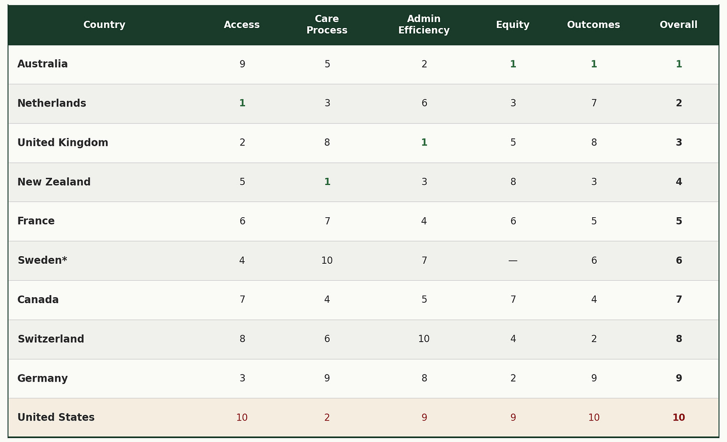 We ranked last on Access to Care. Last on Health Outcomes. And second-to-last on Equity and Administrative Efficiency.