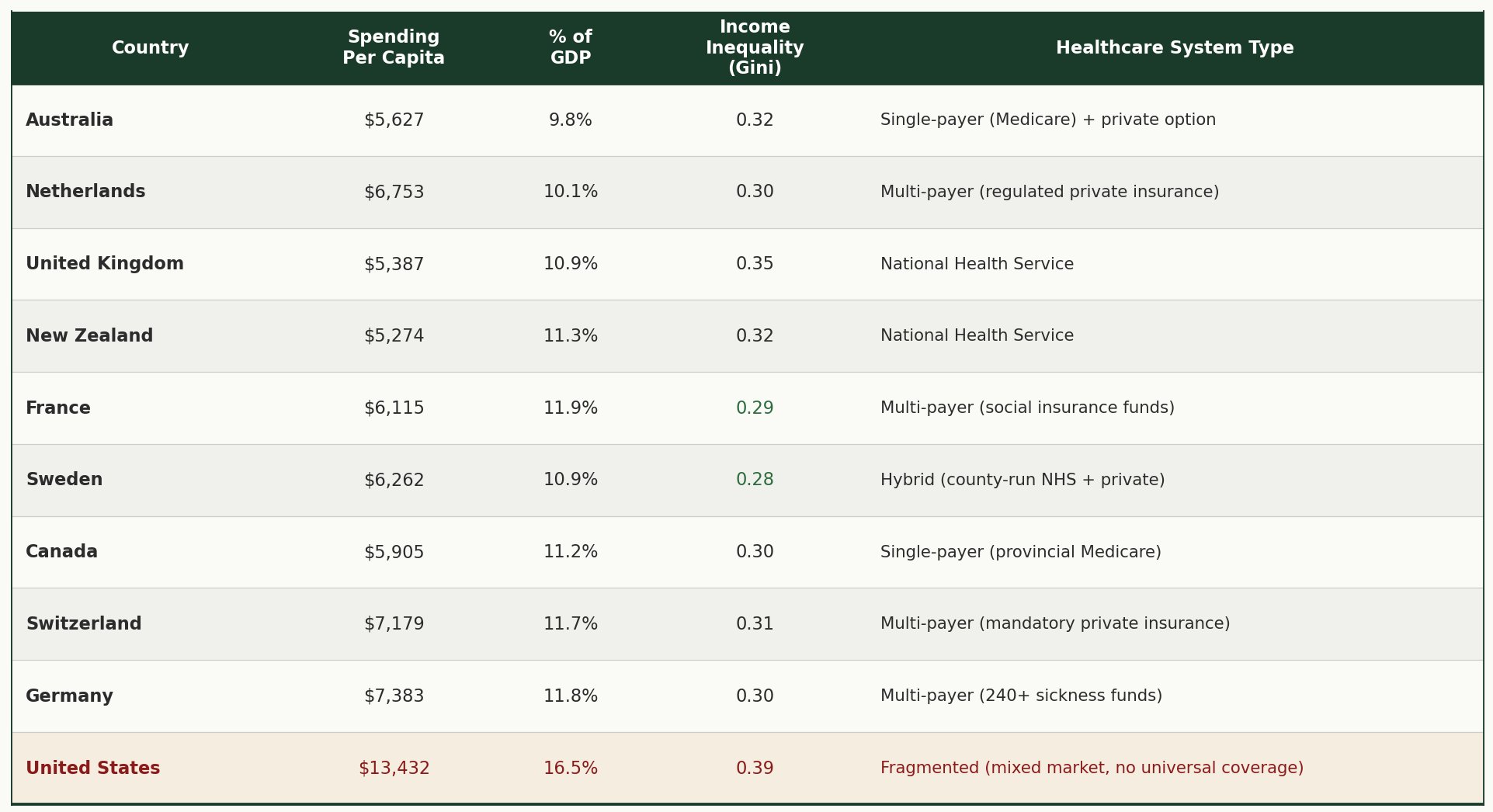To find out, I looked at three other factors: how much each country spends, how unequal their incomes are, and what type of healthcare system they use.