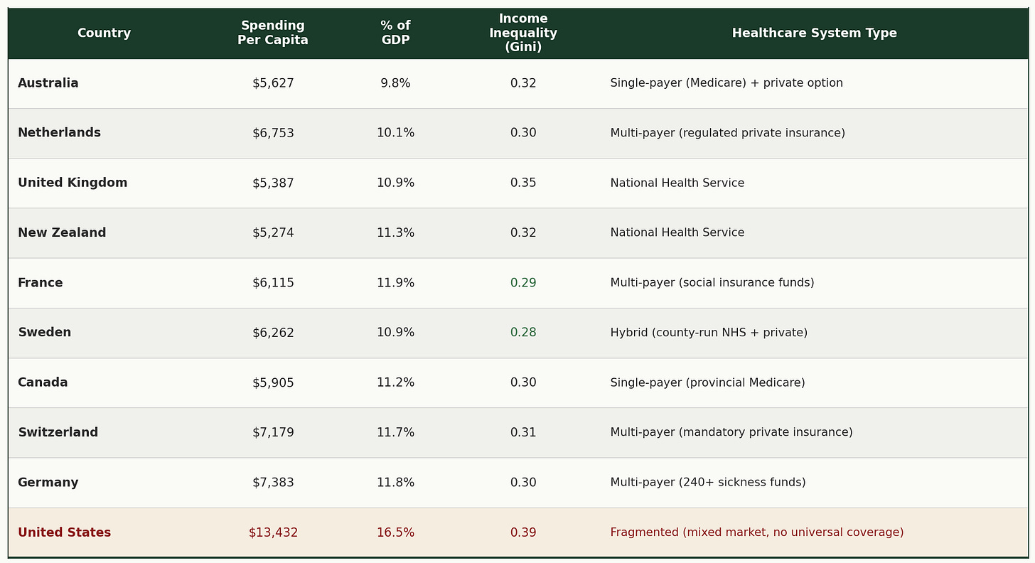 Look at the last column of that table. The “Healthcare System Type.” Every other country has achieved universal coverage. The specific model varies. Australia uses single-payer. Germany uses regulated non-profit sickness funds. The UK runs a national health service. But they all share one thing in common: everyone is covered.