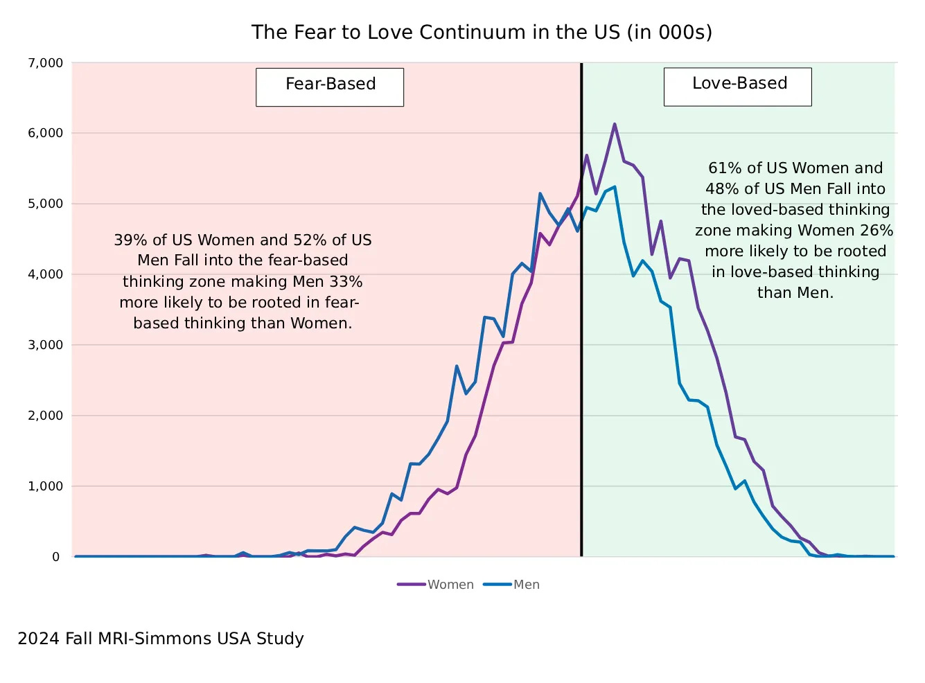It shows something striking. Men in the United States are 33% more likely than women to operate from a fear-based mindset. Only 48% of men fall into what I call the love-based zone, compared to 61% of women.